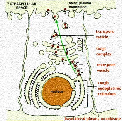 The important role of the Golgi Complex is to make certain the plasma membrane proteins reach their destination. This figure shows the route. Note that the orientation of the protein is maintained so that the region destined to project outside the cell (a receptor binding site, for example), ends up in that place. In order to do this, it must be placed so that it faces inside the vesicle. Return to Menu