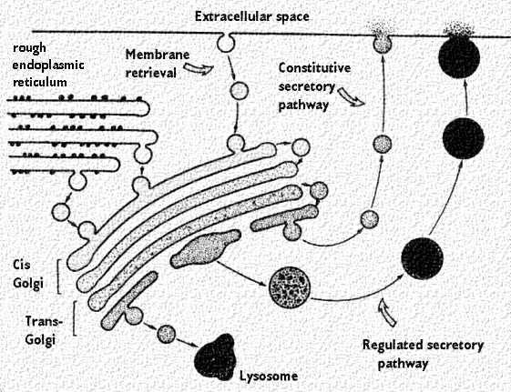 Finally, this cartoon also shows the packaging of lysosomes which will be discussed in more detail in a later section. For more information go to the lysosome web page.