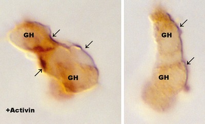 The following photograph shows the results of treatment with activin for 15 hours. The cells were taken from diestrus rats and treated with 60 ng/ml activin during the culture period. The labeling for Biotinylated GnRH has expanded on the GH cells and is seen to cover a larger part of the surface area (arrows). The GH cells are often in clusters which may suggest that activin has stimulated mitosis. GH is detected by the orange-amber label. This can be measured by image analysis and the increase in the average area of label/cell was statistically significant. The references below point to papers that show these data.