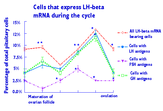 It is well known, from our earlier studies, that percentages of GnRH receptive cells increase 4-fold during diestrus to reach a peak in early proestrus, on the morning before ovulation. Expression of GnRH receptors is seen in over 90% of LH or 88% of FSH cells during this peak. In addition, as shown above, GH cells express GnRH receptors (over 38% of the cells) only during this peak period.